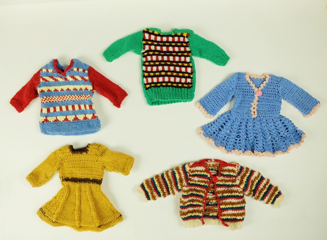 Prachtige nieuwe poppekleertjes, gebreid door een mevrouw van 80-plus.