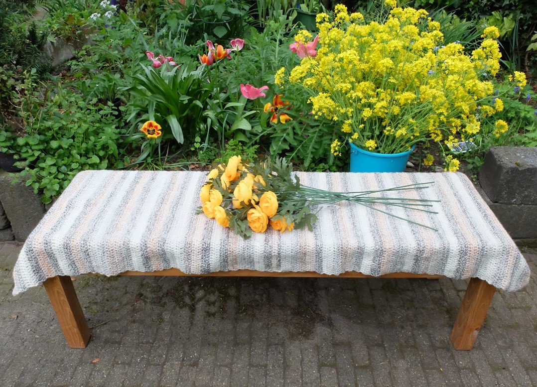 Prachtige omslagdoek die het als kleed op de tafel ook prima doet. Lief van je om deze voor jouw schoonmoeder te haken. Zittend in een rolstoel kan het net iets kouder aanvoelen dan voor mensen die volop in beweging zijn.