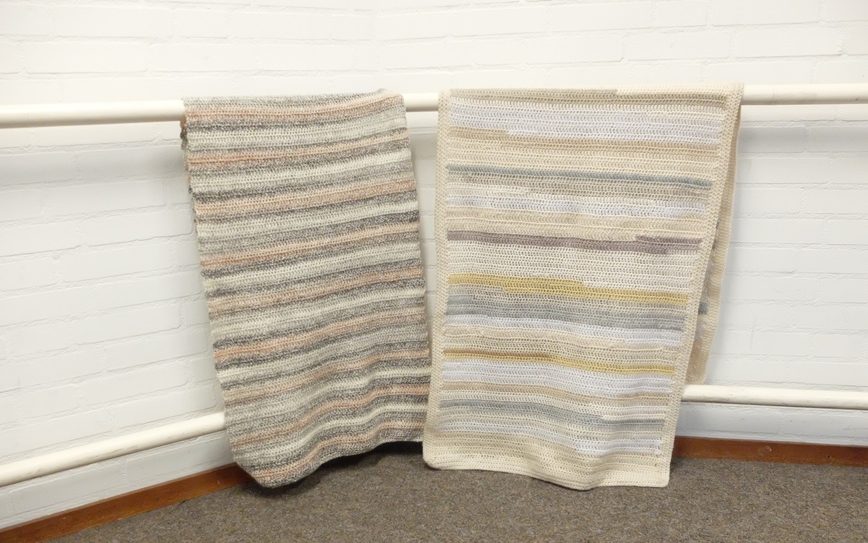 Ik maakte de nieuwe sjaal (links op de foto) net wat smaller dan m’n eigen ouwetje (rechts), want in een rolstoel hoeft het niet helemaal over de rug. Het was een fijn haakwerkje, en deze maat blijkt ook fijn te zijn: 50 cm. breed.