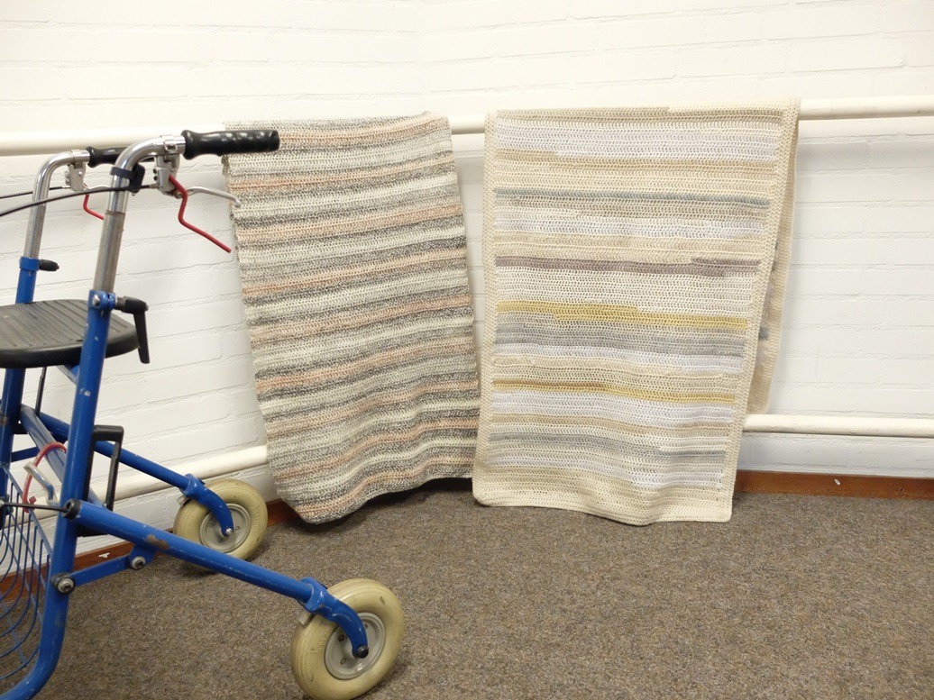 Soms is ‘eenvoudig haken’ precies genoeg. Ik haakte een eenvoudige sjaal voor m’n schoonmoeder en ik dacht: misschien kan ik ook wel iets op gang brengen om sjaals te gaan haken voor ouderen in een rolstoel. Geen gehannes met vesten en jassen, waarbij het soms lastig is om oudere lichaamsdelen mee te buigen. Maar een simpele gehaakte omslagdoek voor oudere rolstoel-gebruikers. Ik weet dat er veel vrouwen zijn die dekentjes haken voor babies met een moeilijke start in het leven: reuze sympathiek! En ik dacht: haken voor ouderen is misschien ook wel een goed idee, dus daarom laat ik deze foto nog een keer zien. Voor als je zin hebt om wat te haken en je zoekt een goede bestemming. Dan is het enige advies wat nodig is: maak hem niet te breed, ongeveer 50 cm. is genoeg. We merkten dat dat precies de goede breedte is.