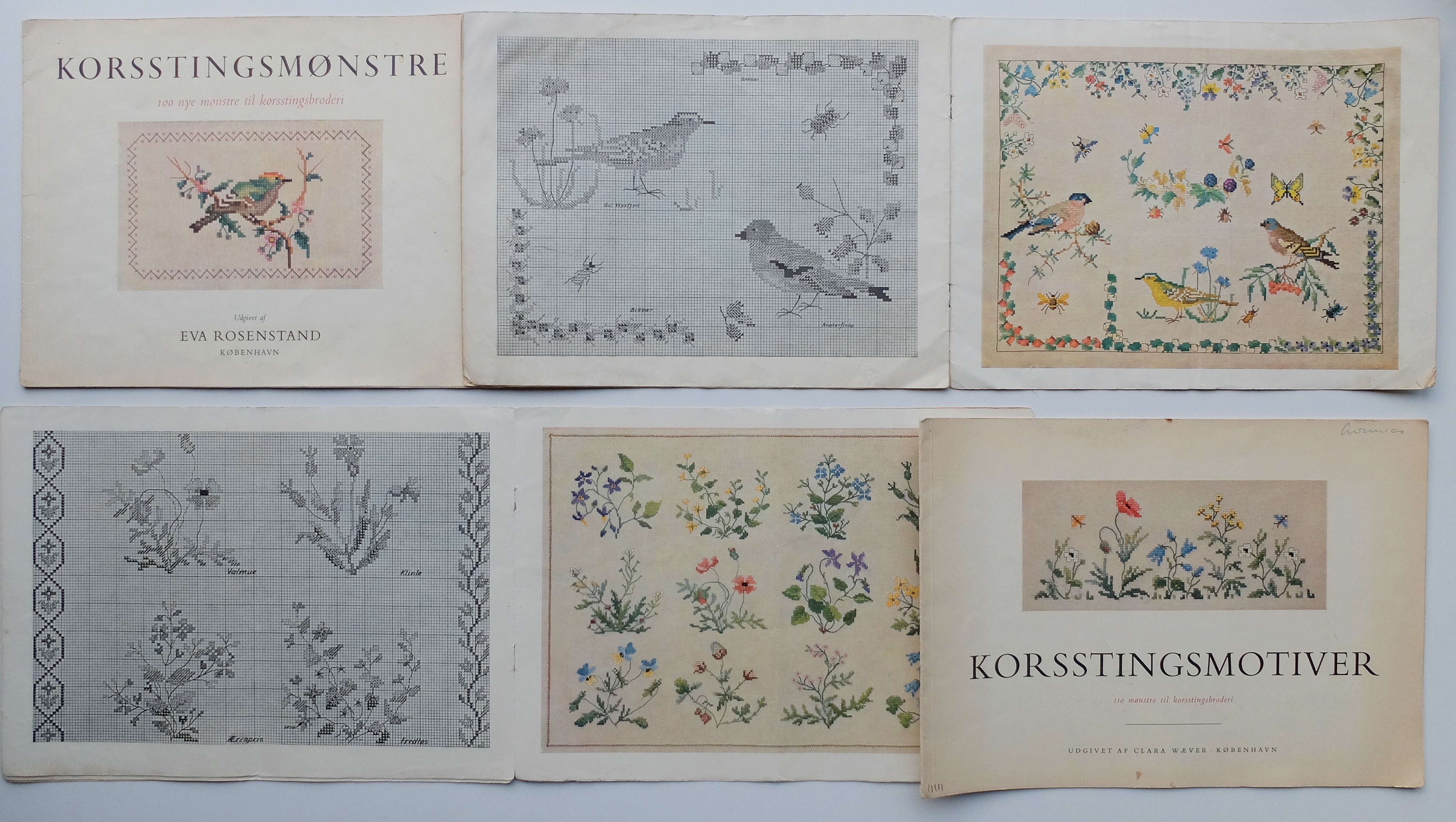 Ze hebben allemaal wel wàt: op het ene exemplaar een vlekje op de voorkant, bij een ander exemplaar een vouw middendoor. Bijna allemaal hebben ze de naam van de vorige eigenaresse schuin geschreven in de rechterbovenhoek (dat deed bijna iedereen vroeger). En veelal zijn de zijkanten wat gekreukeld omdat ze door het grote formaat net wat uitstaken ten opzichte van andere handwerkboeken. Toch zijn dit geliefde boeken, de oude ‘Heften’ vol met borduurpatronen van vogeltjes en bloemetjes. De ontwerpen zijn van Eva Rosenstand en Clara Waever. Ik heb nu weer van alle drie de boeken een paar exemplaren, en dat past mooi in de boekenweek, met als thema natuur.