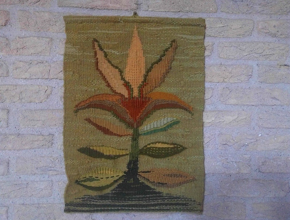 Dit kleedje in een bijzondere kleur en met een gestileerde plant is een boeiend wandkleedje, wat ik met liefde in m’n shop plaats.