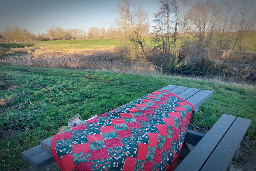 Ik had van alles mee: M’n kerst-picknickkleed, de placemats om de perfecte foto te maken met die Glühwein erop, en nog zo wat. Het was heel leuk om daar te zijn, maar superkoud! Bovenop de nieuwe Scheldedijk stond een picknicktafel, maar het kleed waaide er gelijk weer af. Je kon er eigenlijk nauwelijks langer dan twee minuten blijven staan, zo koud was het.