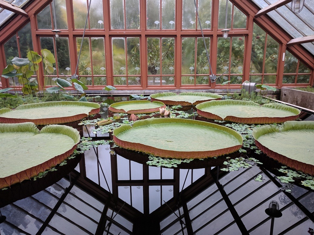 De Victoria Amazonica is een Reuzewaterlelie. De Hortus Botanicus in Utrecht heeft er een speciale (hele mooie!) kas voor. Na afloop van ons museumbezoek liepen we ook even de Hortus binnen, om te kijken of de oudste Gingko Biloba boom al mooi geel is. Nog niet, maar de waterlelies zijn altijd prachtig om te zien. Bij een eerder bezoek legde ik wel eens een geborduurd mobielhoesje op de bladeren, maar er stond nu een groot bord met ‘verboden aan te raken’, hoewel de bladeren wel een gewicht van 40 kg. kunnen dragen. Er lag wel een groot blad op de grond, en daar kon m’n mode-tas dan wel even naast liggen. Dat geeft ook een idee van hoe groot deze bladeren zijn. En van m’n geborduurde mode-tas natuurlijk! Gemaakt van een oud borduurwerk en afgewerkt met oud fluweel. Dat paste wel bij de zojuist bezochte tentoonstelling.