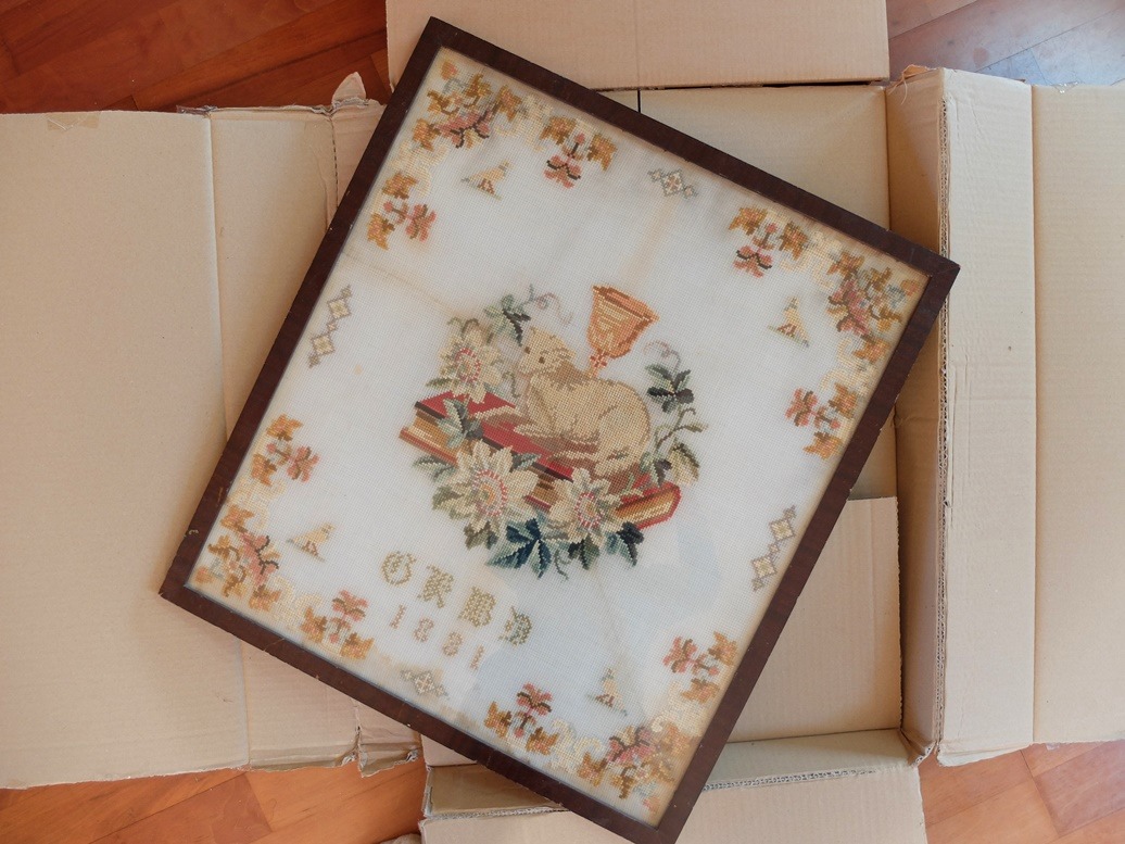 Er mochten geen foto’s worden gemaakt van dit beroemde werk, dus die kan ik niet laten zien. Wel zijn er voldoende foto’s en informatie op internet te vinden. Het geborduurde schilderij uit mijn shop was minder oud (uit 1881, ook wel bijzonder), en de geschiedenis is mij onbekend. Wie weet welke omzwervingen het al had gehad vóórdat het in mijn shop kwam. Ik weet alleen het laatste stukje van de verplaatsing van dit schilderij, en dat is gelukkig allemaal goed gegaan.