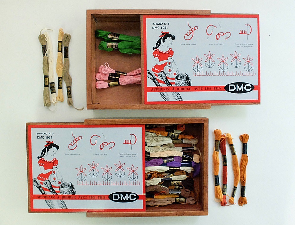 In Nederland wordt vooral geborduurd in kruissteek, maar in Frankrijk wordt ook de steelsteek en de kettingsteek veel toegepast. DMC wilde deze andere steken in Nederland ook wat promoten en daarom is er een partijtje van deze dozen hier terecht gekomen. Uit die partij kocht ik er twee (om bij te dragen aan die promotie, en omdat ik het zo leuk vond om deze dozen te laten zien), en die zet ik in m’n shop. Het zijn nieuwe dozen, en heel praktisch. Het deksel kan er ook andersom in worden geschoven, zodat de bedrukte voorkant onderop komt.