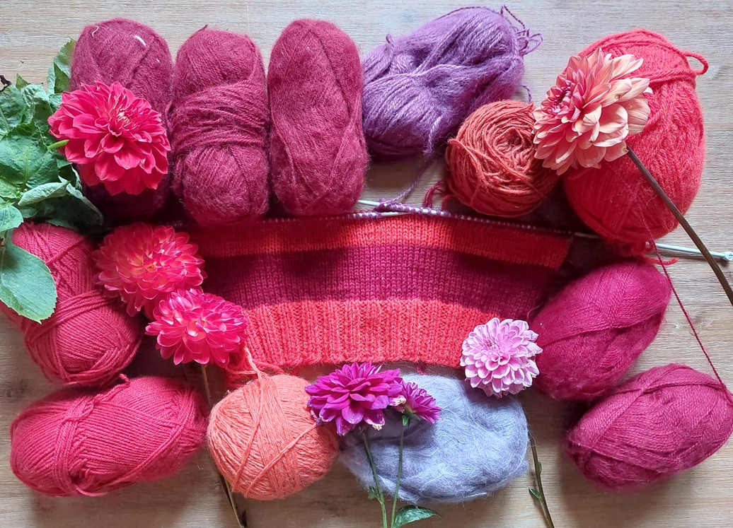 Dus nu dacht ik: ik vraag het op mijn blog! Hebben jullie een idee hoe ik deze kleuren tot een geheel kan maken? Ik wil er een streepverdeling in, maar het moet wel een beetje harmoniëren. Het mag bont zijn, net als m’n bos Dahlia’s, maar het moet niet te gek worden. De rode wol kan ik bijkopen, dus ik heb wel genoeg. Iemand een idee?