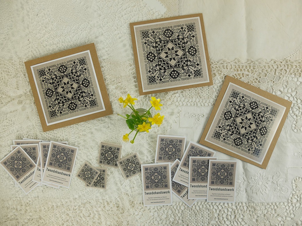 Deze kaarten maakten we met een eigen afgedrukte foto. Het motief komt uit de 17e eeuw en komt in meerdere boeken met borduurpatronen voor. Nu zijn we bezig om ook visitekaartjes te maken met dit motief, dus voor de komende tijd wordt dit mijn herkennings-motiefje voor Tweedehandswerk.