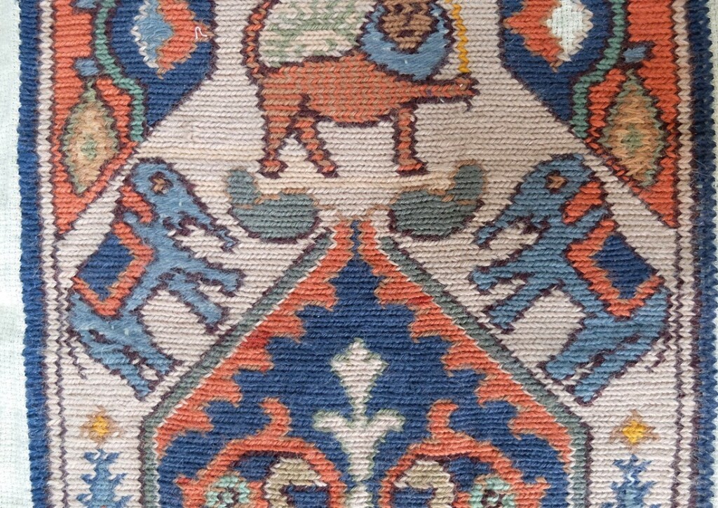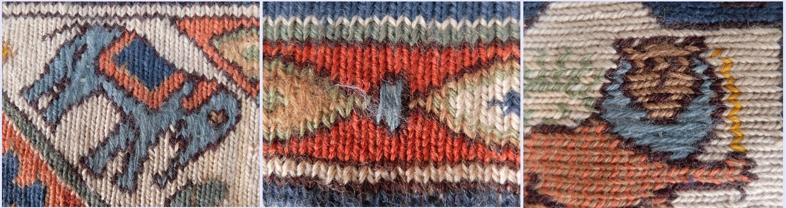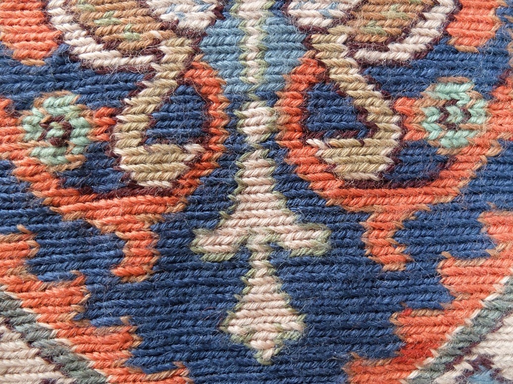 Hoe heb ik het trouwens kunnen denken, dat die ene kleur versleten zou zijn? De Nederlandse wol die speciaal werd gemaakt voor smyrna en sudan en kelim stond juist zo goed bekend vanwege kleur-echtheid en motten-werend. De kleden die nu zo’n zestig jaar oud zijn of nog ouder, zijn nog steeds erg mooi om te zien en als ze niet ergens op de grond hebben gelegen zijn ze vaak nog niet versleten. Dit kleed plaats ik later in m’n shop, en dan kan iemand die paar plekjes grijs-blauw nog afmaken en dan heb je een prachtig kelimkleed!