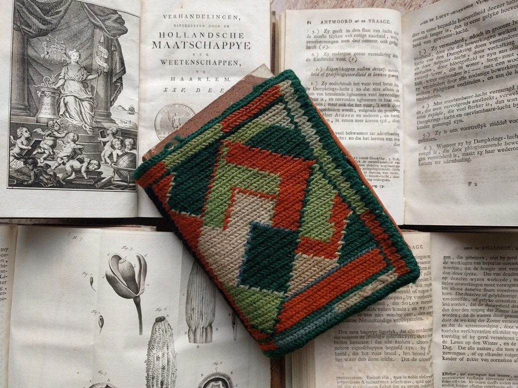 Bij mij thuis ben ik niet de enige die van oude boeken houdt; mijn man vind het ook leuk om een aantal echt oude boeken in de kast te hebben staan. Hij heeft een stapeltje Verhandelingen uitgaven door de Hollandsche Matschappye der Weetenschappen, uit 1780. Lekker oud en mooi om te zien. Ik gebruikte ze als achtergrond voor dit kelim boekomslag. Zulke oude boeken stonden vroeger ook altijd al mooi in de deftige kasten, maar boeken die veel gebruikt werden kregen een boekomslag. Dit omslag zou uit de dertiger jaren kunnen komen van de vorige eeuw. Ik vond het in een rommelwinkeltje en heb zin om het na te maken. De kleuren en de vormen spreken me aan!