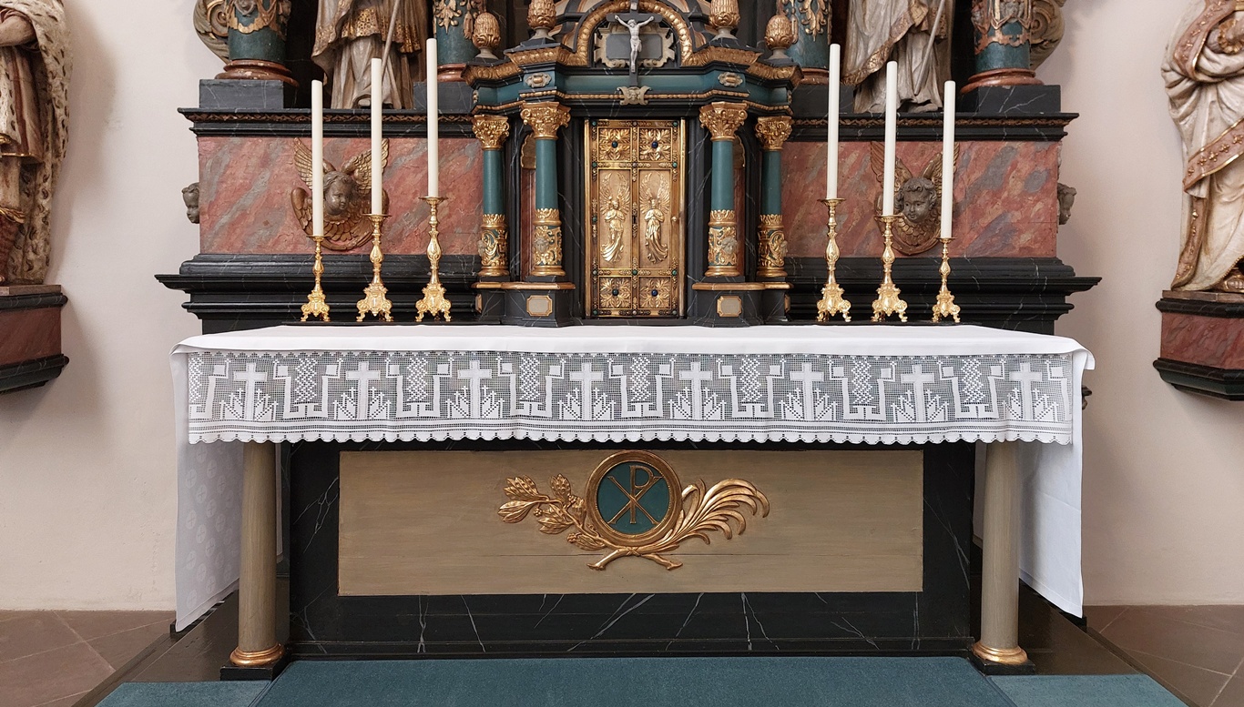 In eerdere blogjes waarin ik verslag deed van het bezoeken van een monumentale kerk, probeerde ik ook altijd iets van handwerk te laten zien. Ook dit keer lukte het om iets te vinden: een kleedje met een rand van fijn filethaakwerk.