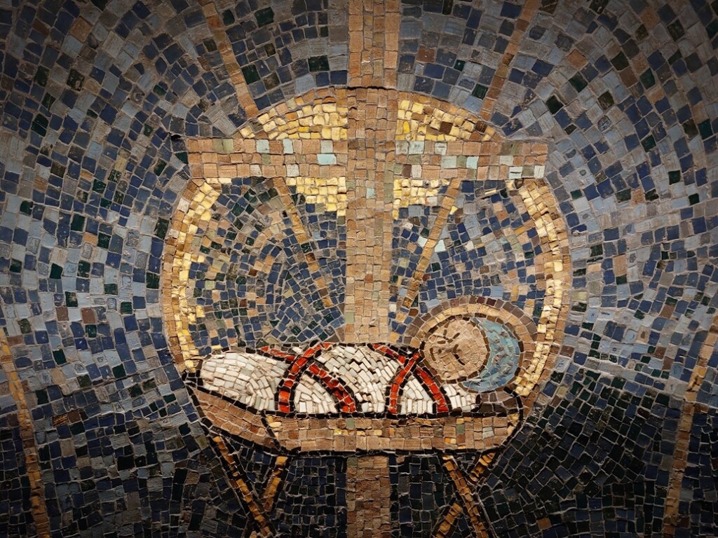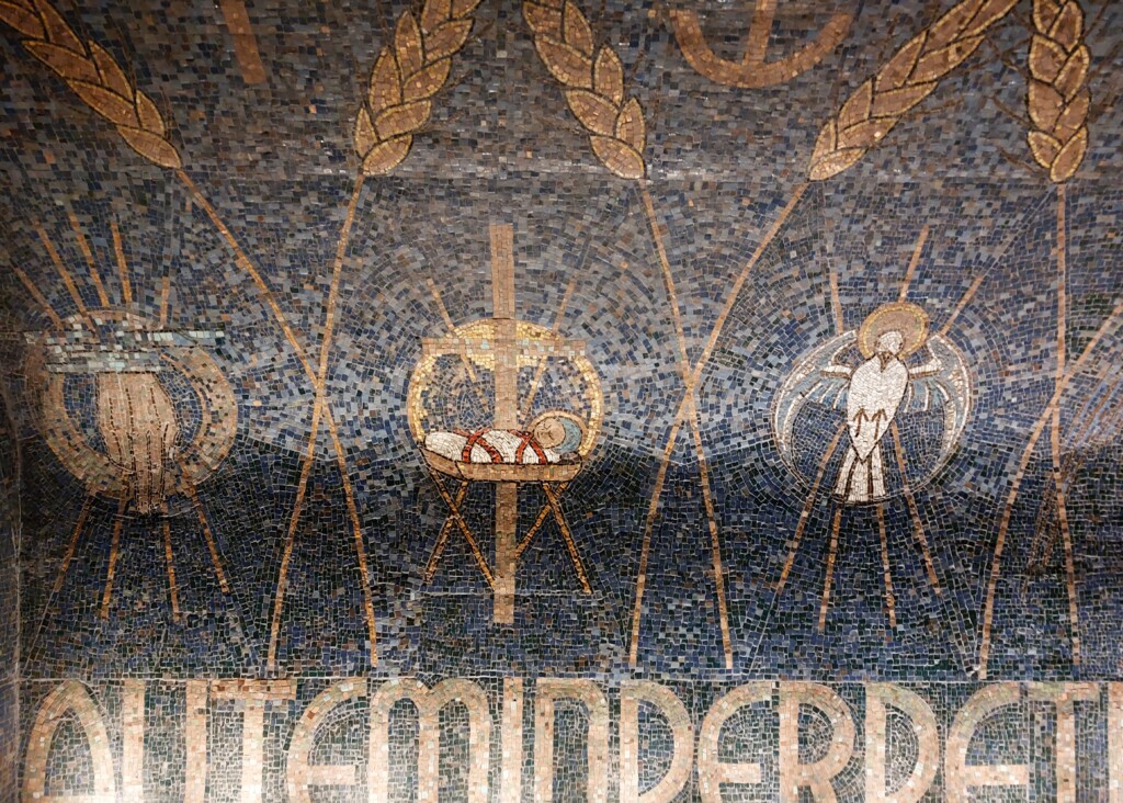 Dus hier is het ons kerstfeest op gebaseerd: miljoenen malen weergegeven in vele vormen. Hier in een eeuwenoud mozaiek wat het kindje in de kribbe plaatst tegen de achtergrond van het kruis.