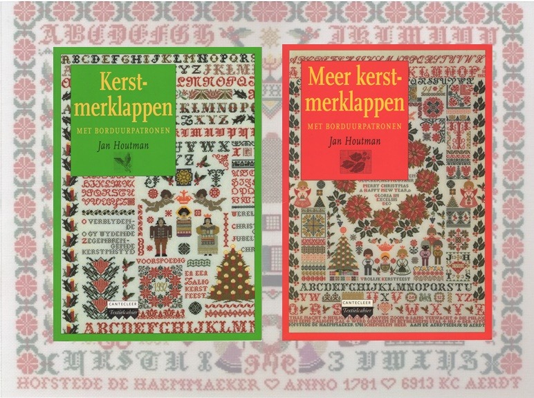 De boeken bevatten een grote schat aan kerst-gerelateerde borduurpatronen, zodat je ook zelf een merklap kunt samenstellen. Bij de eerste bestelling sluit ik de foto bij die onder de boeken te zien is, van die eens zo graag bezochte merklappen-boerderij in kerstsfeer.