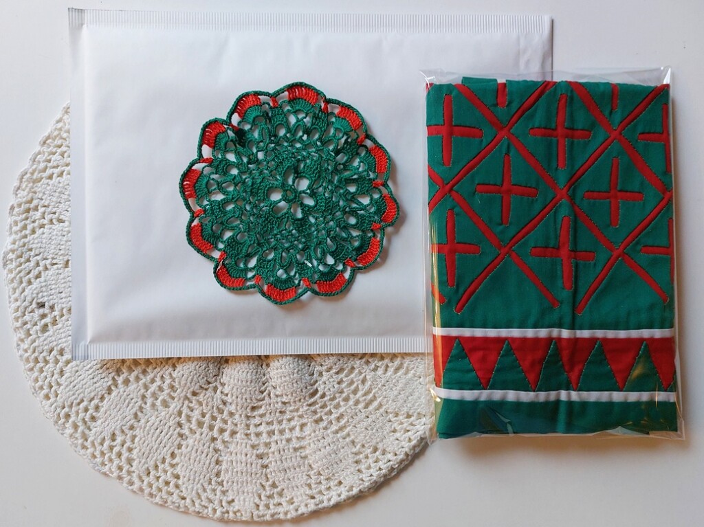 Een mooi en origineel kleedje in de Cuna-techniek stond meer dan tien jaar in mijn shop. Als ik zelf iets mooi vind, dan begrijp ik soms niet waarom het heel lang in mijn shop blijft staan voordat het wordt besteld. Ik had in deze kersttijd al gedacht “ik hou het lekker zelf”, maar nu werd het toch besteld en ging het vandaag op de post. Als laatste bestelling van dit jaar. Het is een kleedje wat veel mensen denk ik wel eens gezien hebben, als ze m’n shop doorscrolden. Het bobbelt een beetje, dat had ik ook vermeld en het daarom niet te duur gemaakt. De ontvanger hoeft alleen maar even de tegenvoering aan de achterkant half los te halen en opnieuw vast te zetten, dan is het bobbelen ook verdwenen.