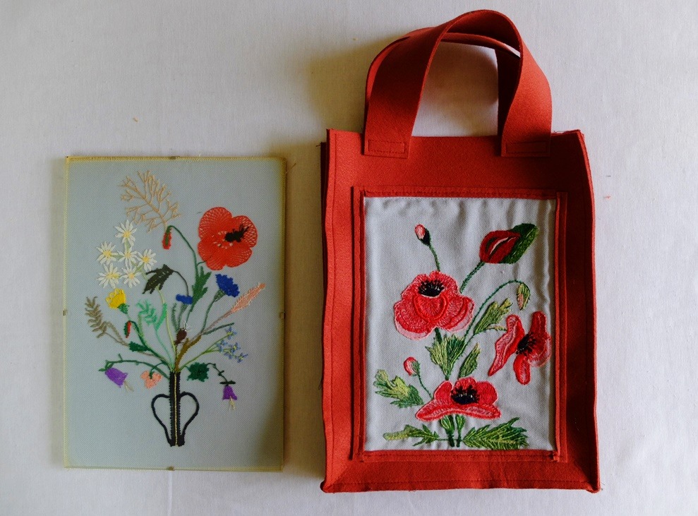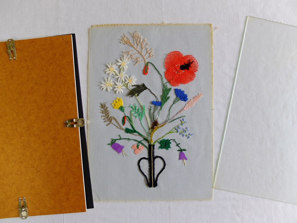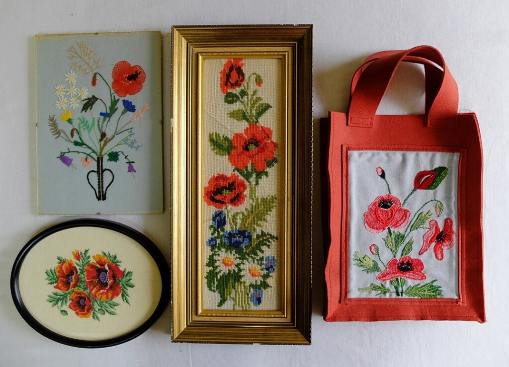 En nòg een klaproos-borduurwerk voor bij dit blogje: ditmaal geborduurd met wol. Het gebarsten glas wil graag naar de glasbak en dan kan er met het mooie borduurwerk ook iets leuks worden gedaan. Zo blijven de klaprozen bloeien ook nadat ze in de tuin hun blaadjes hebben laten vallen.
