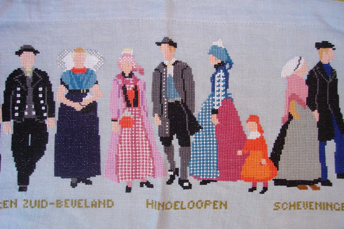 Laat ik maar eens van wal steken met m’n serie over Nederlandse klederdrachten. Verdeeld over drie enveloppen heb ik twaalf losse poppenpatronen die werden uitgegeven door “Prinses”. Bij de omschrijving hoe de kleertjes in elkaar genaaid moeten worden, staat telkens een typerende tekst van de volksdracht in een bepaalde plaats. En die leek me leuk genoeg om twaalf keer over te nemen. Ik ga proberen ook twaalf foto’s te plaatsen van iets wat met klederdracht te maken heeft en vandaag is dat als eerste: een borduurwerk wat mijn grootmoeder maakte!