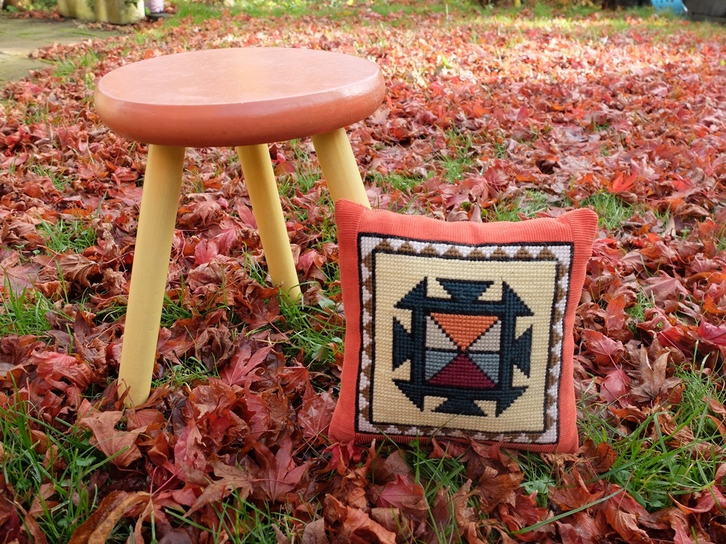 Het krukje ging naar de kringloop, samen met een heleboel ander spul wat weg ging. Maar toen stond ik ermee in m’n handen en dacht nog even met weemoed aan de kleurtjes van vroeger. Toen hadden we een hele kamer in die kleuren. Ik liep ermee naar buiten voor een snelle foto. En ik vroeg me af of anderen dat ook doen: van sommige spulletjes die je wegdoet nog even een foto maken. Gewoon voor de herinnering. Dàg krukje, veel plezier ergens-anders!
