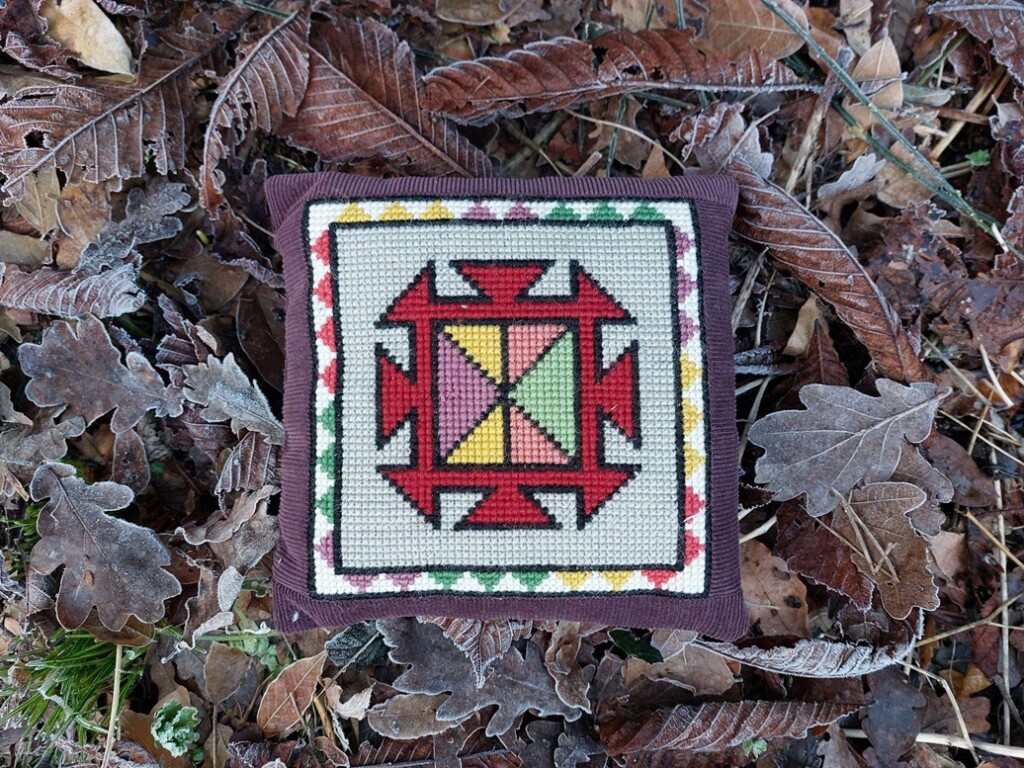 Dit is รฉรฉn van de dagen waarvoor ik de hele winter en herfst een plekje achterin de tuin heb gehouden waar de bladeren mochten blijven liggen. Ja, voor de egels en vogels en insecten, dat ook, zij moeten ook een plekje hebben in de nieuwbouwwijk waar ze kunnen schuilen. Maar ook omdat er meestal in januari of februari nog een paar dagen komen waarop het licht gevroren heeft. Dan is het zo heerlijk om op zondagmorgen vroeg naar buiten te gaan (zonder jas, alleen een wollen trui) en dan het geknisper onder je voeten te horen. En om te kijken naar die bruine blaadjes met hun witte randjes en laagjes. Nog even naar binnen, om een kussentje te halen wat ik juist heb liggen. Dit kussentje is รฉรฉn van m’n fijnste kussentjes, en liet ik hier en hier en hier al eerder zien. Ik hou nog steeds van dat sterke motief. En dan nu in contrast met die bevroren bladeren en uitgebloeide bloemen!