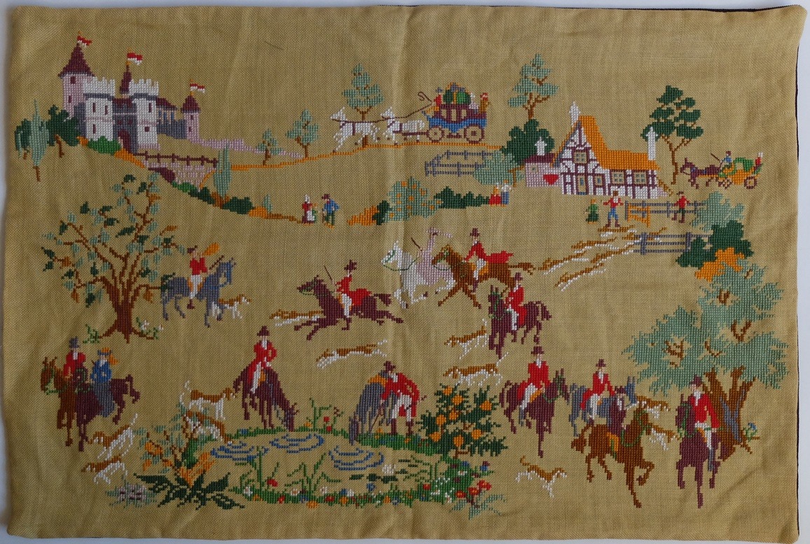 Zo’n borduurwerk grenst aan the Art of Embroidery, en dat zullen veel mensen het niet met me eens zijn, want het gaat alleen maar om kruisjes produceren. De ‘Art’ ligt dan ook meer in het ontwerp, wat ooit iemand maakte van een landelijk tafereel. Het is toch wel een soort Art-impressie, met al die ruiters in hun rode jasjes en dravende en drinkende paarden. Op de achtergrond een kasteel, een koets, een boerderij. Een boer en boerinnetje die met elkaar overleggen en op de voorgrond al die paarden en hun berijders. Met een foto krijg je zoiets niet voor elkaar om dat allemaal in één voorstelling te krijgen, en met een schilderij ook niet. Dus heeft de borduurkunst ook wel een steekje vóór op andere kunst-vormen, ook al gaat het alleen maar om het produceren of reproduceren van kruisjes, ik weet het. Maar in een goed-ontworpen borduurwerk kun je van alles bij elkaar passen en dat maakt dat het toch een eigen plaats onder de beeldende kunsten heeft (vind ik).