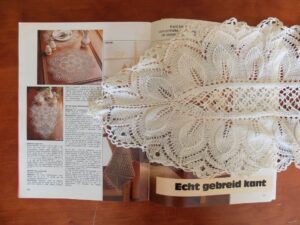 Op het eerste gezicht zou je misschien denken dat al die oude witte kleedjes gelijk zijn, maar dat zijn ze ècht niet! Er is een heel verschil tussen dikte van gebruikte garens, ingewikkeldheid van patronen en ook in toegepaste technieken. Het bovenste kleedje is gehaakt van wat grovere katoen, en het onderste kleedje is gebreid met heel dun garen. Maar ook een overeenkomst: deze kleedjes zijn allebei ovaal, en zo kwamen ze samen op de foto terecht. Het bovenste kleedje liet ik een paar dagen eerder zien, als ideale ondergrond voor een vaas met pioenen op een tuintafel.