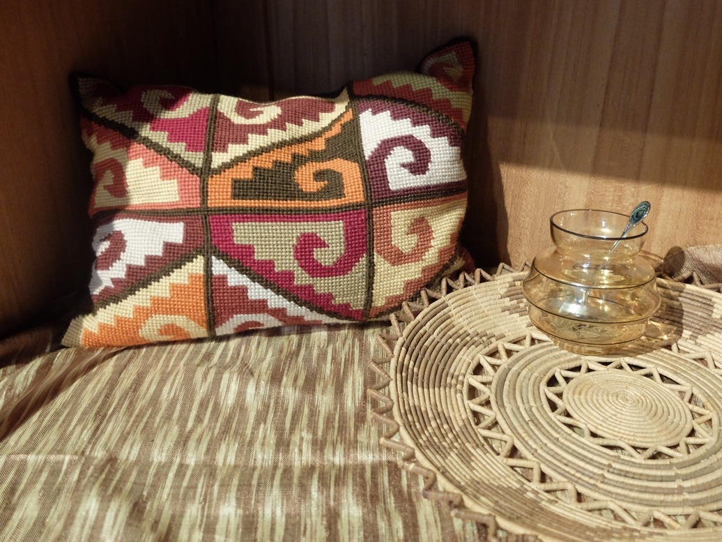 En nu kijk ik even rond ìn m’n huis en zoek een kussentje. Niet altijd heb ik ze klaarliggen voor de zondag, dus nu één die ik al eerder liet zien. Dit kussentje maakte ik vroeger en ligt in een kast te stralen in een donker hoekje. Het zijn donkere dagen en voor lichtstralen moeten we moeite doen. Terwijl ik gister luisterde naar de toespraken, viel m’n oog op de lichtstralen op het podium van het stadion. Het leken wel ikat-patronen, net als m’n sjaaltje wat ik die dag droeg. Hieronder zie je het sjaaltje wat ik even onder het kussentje legde, in het donkere hoekje.