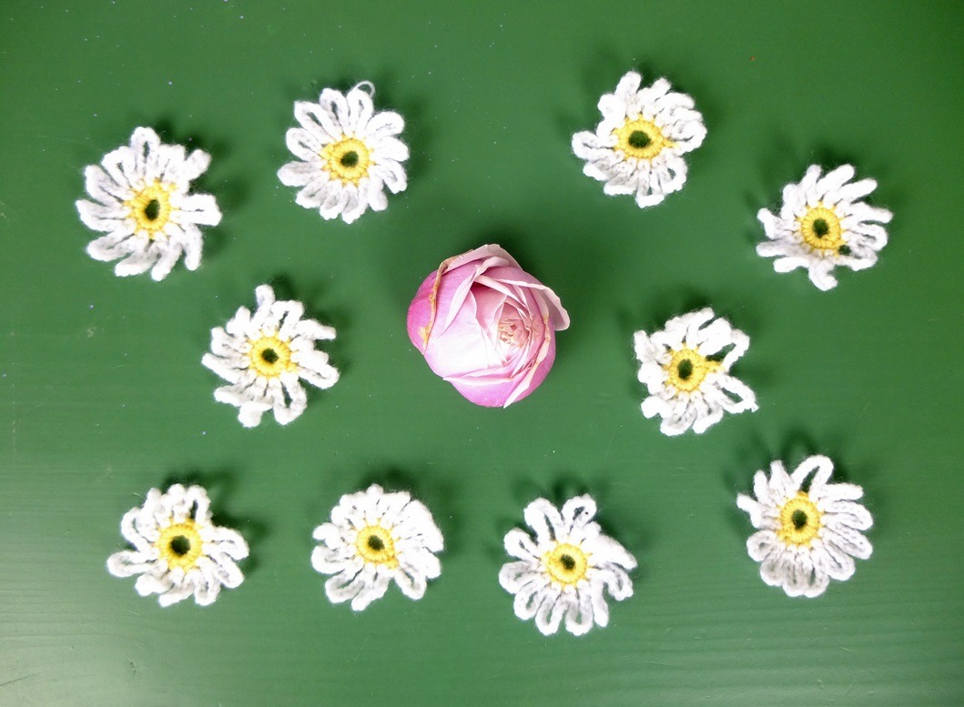 M’n zus kwam een dagje naaien en nam een bos meibloemen voor me mee, geplukt uit een overvloedige tuin. Daar ben ik blij mee! Ik had juist een quiltje neergelegd waarin de kleuren zo goed uitkomen vanwege het zwarte contrast. Zonder me daarvan bewust te zijn, pakte ik een zwarte vaas voor de bos bloemen, en zonder erbij na te denken zette ik de gevulde vaas naast het quiltje. Pas toen we samen koffie dronken, drong het tot me door: “Hé, dat staat mooi zo naast elkaar!” Soms werkt toeval heel goed uit. En ik ben bezig met nog wat margrietjes te haken en die lagen
