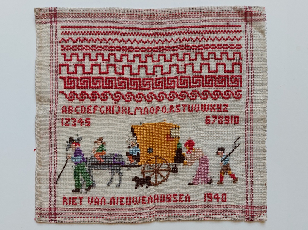 Een mooi merklapje. Met een jaartal: 1940.En met een naam: Riet van Nieuwenhuijssen. Dat had ze vast nooit gedacht, dat haar naam nog eens op internet zou verschijnen. Vooral niet omdat internet nog niet bestond!
