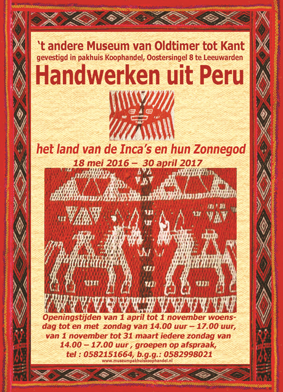 Waarschijnlijk heeft niet één cultuur zo’n rijkdom aan technieken en zo’n verfijning gekend als de Peruaanse. De geschiedenis van het Incarijk spreekt nog steeds tot de verbeelding. In Leeuwarden is een lang-lopende tentoonstelling in het “Andere museum van Oldtimer tot Kant” over Handwerken uit Peru. Een eigen verhaal over reizen, cultuur, handwerken en kunst uit een land met een rijke cultuurgeschiedenis.