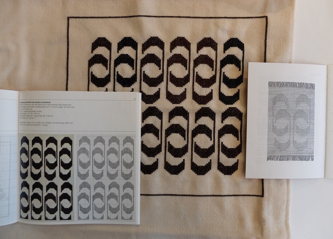Het boekje Damast op vier schachten was besteld, en ik zag een bekend motief: dit had ik vorig jaar ook eens geborduurd, uit het boek Moderne kruissteekmotieven. Je moet je eigenlijk helemaal niks aantrekken van de titels van handwerkboeken. Want zou dit motief nou ècht ‘modern’ zijn geweest? Ik denk ook al niet ten tijde dat dit boek voor het eerst werd gepubliceerd. Het is waarschijnlijk een oud Peruaans motief, maar in beide boeken staat dat er niet bij.