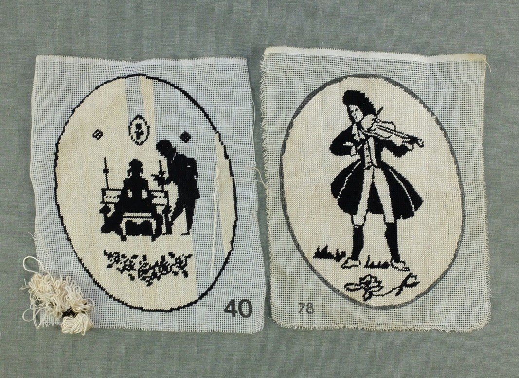 Borduurwerkje Silhouet Pianospelen (om zelf af te maken en de voldoening te hebben dat je met weinig werk toch een leuk borduurwerkje hebt). En Silhouet Vioolspel (als je zelf nog een oud ovaal lijstje hebt of het ergens op wilt naaien).
