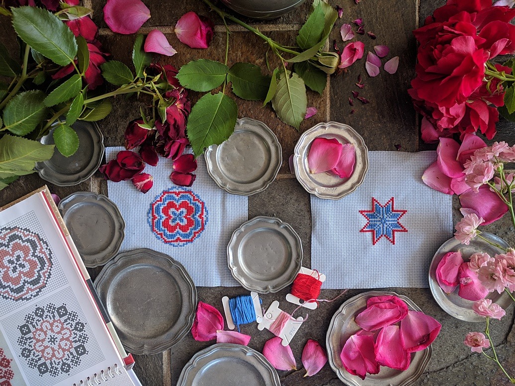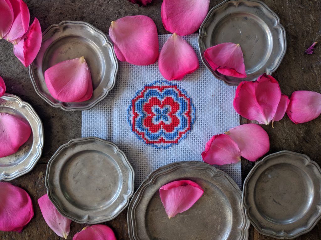 Nog een rondje geborduurd uit het Cirkelboek. Het lijkt op de tinnen bordjes die ik al m’n hele leven bij m’n moeder thuis zag staan, dezelfde lichte inkepingen.
