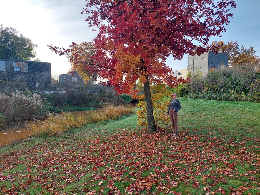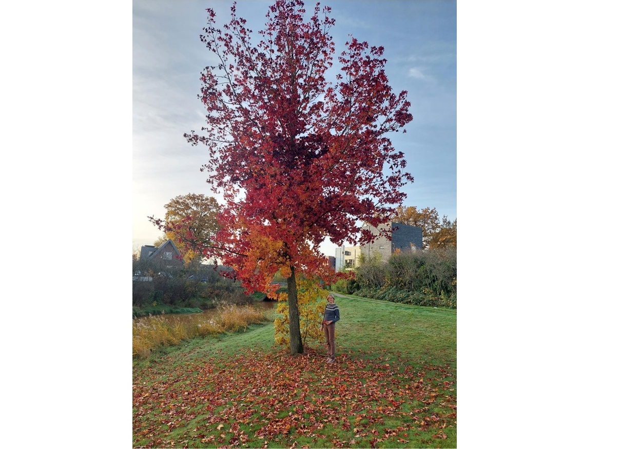Wat een herfstzon op deze ze novembermorgen! Eerst even een wandeling in de wijk. Hier staan een paar mooie Liquidambars (wij noemen de bomen vaak bij hun soortnaam), en daar wil ik mijn nieuwe trui showen. Hij is eindelijk af!