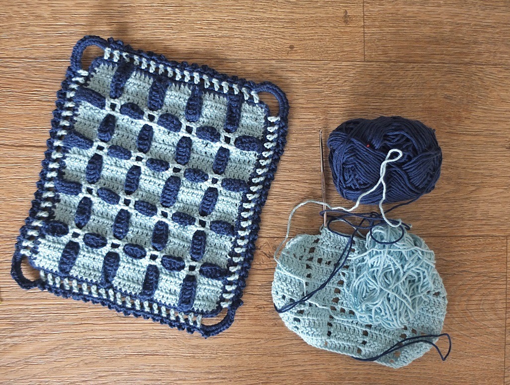 M’n gastvrouw (boven de tachtig) haakt de mooiste pannelappen en toen ik weer eens bij haar op bezoek ging nam ik zelf ook een haakwerkje mee. Dat praat fijn. Bij een ander moet je niet willen om ingewikkelde telpatronen uit te werken dus zorg ik dat ik altijd een eenvoudig werkje heb klaarliggen wat ik zรฒ mee kan nemen. Dit keer was dat een simpel lapje met gehaakte ‘stokjes’, waar ik straks nog een zakje van maak. Zulke dingen ontstaan bij mij vanzelf. Als ik ergens een bolletje katoen tegenkom, dan begin ik soms gewoon te haken en zie ik wel wat er van komt. M’n gastvrouw vond het een leuk idee, zo’n gehaakt zakje, en vertelde nu wat over haar eigen project. Ze wilde graag weer eens wat omhanden hebben, maar liever niet meer iets heel groots.
