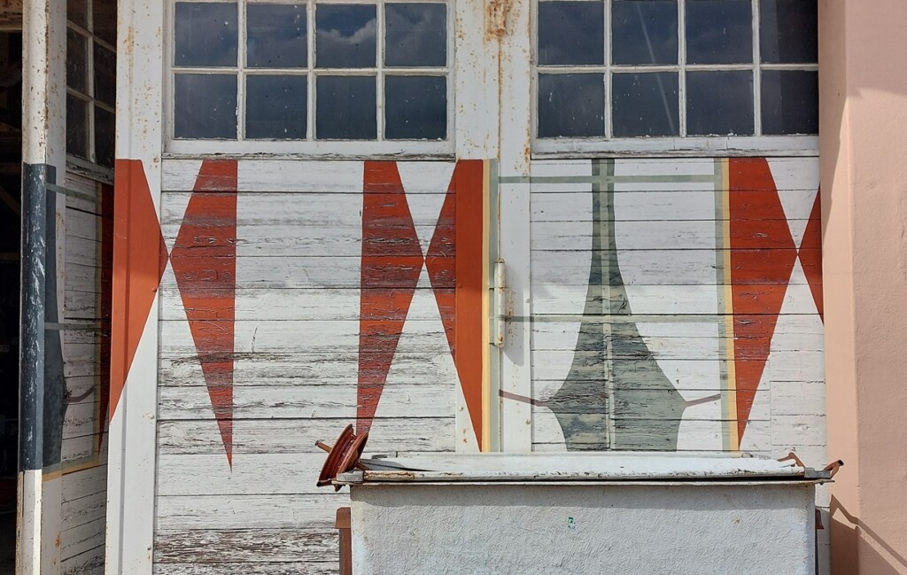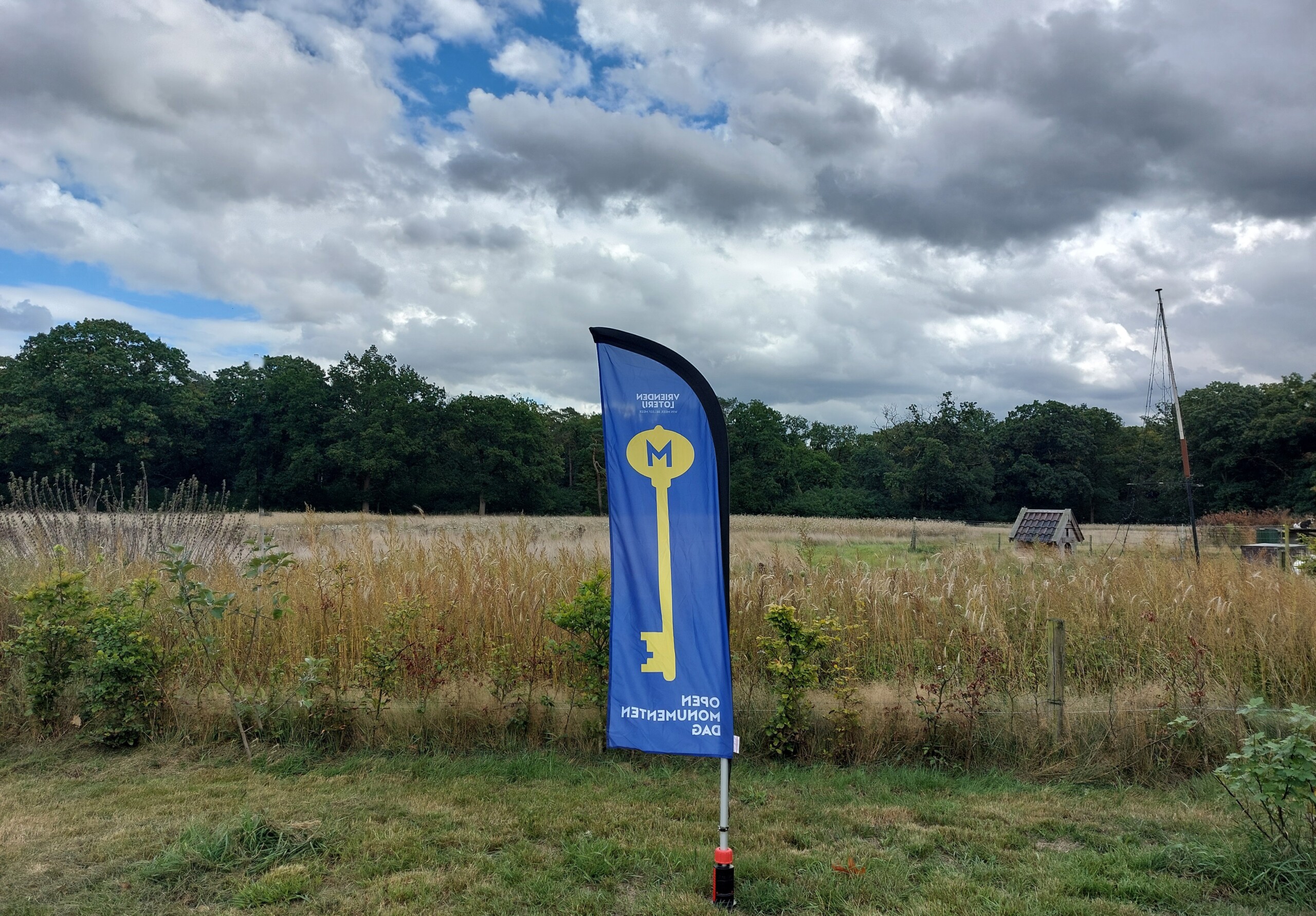 Thema’s en Tijdslijnen komen altijd weer terug bij Open Monumentendagen. Er is meestal meer te zien dan er in een dag past. In dit blogje ook wat terugkomende kleuren, zoals blauw en roodbruin. Na vertrek uit Arnhem gingen we nog met de auto naar een locatie waar je anders nooit mag komen: de velden grenzend aan vliegveld Deele. Een bijzondere rit over wegen waar je je ogen uitkijkt en iets voelt van hoe het landschap er hier 80 jaar geleden uitzag. Hier staan drie vliegtuighangars die er van buiten precies uitzien als een boerderij. Met verf zijn ramen op de hangardeuren geverfd en de vijand heeft het nooit ontdekt want de boerderijen staan er nog steeds. We kregen een uitleg van de nieuwe eigenaar die het hele terrein heeft gekocht en verbaasden ons over wat er allemaal bedacht is om ons land te verdedigen.
