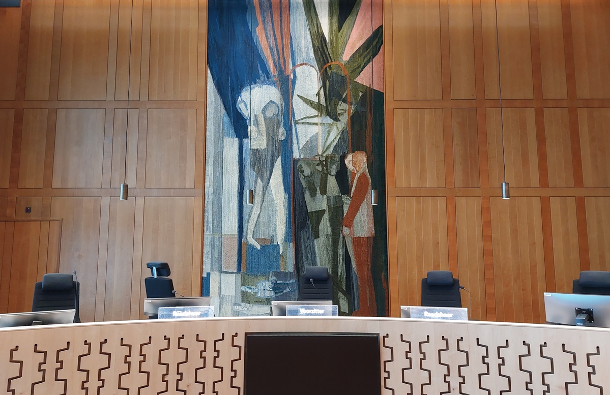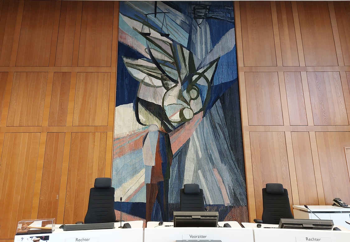 In dit gebouw uit begin jaren zestig komen bepaalde belijningen terug en is ook -geheel passend bij de tijd – de aankleding met wandkleden in overeenstemming met de uitstraling die de architect beoogde. En meer nog: de prominente wandkleden achter de zitplaatsen van de rechters zijn doelbewust gekozen vanwege de boodschap die zij overbrengen.