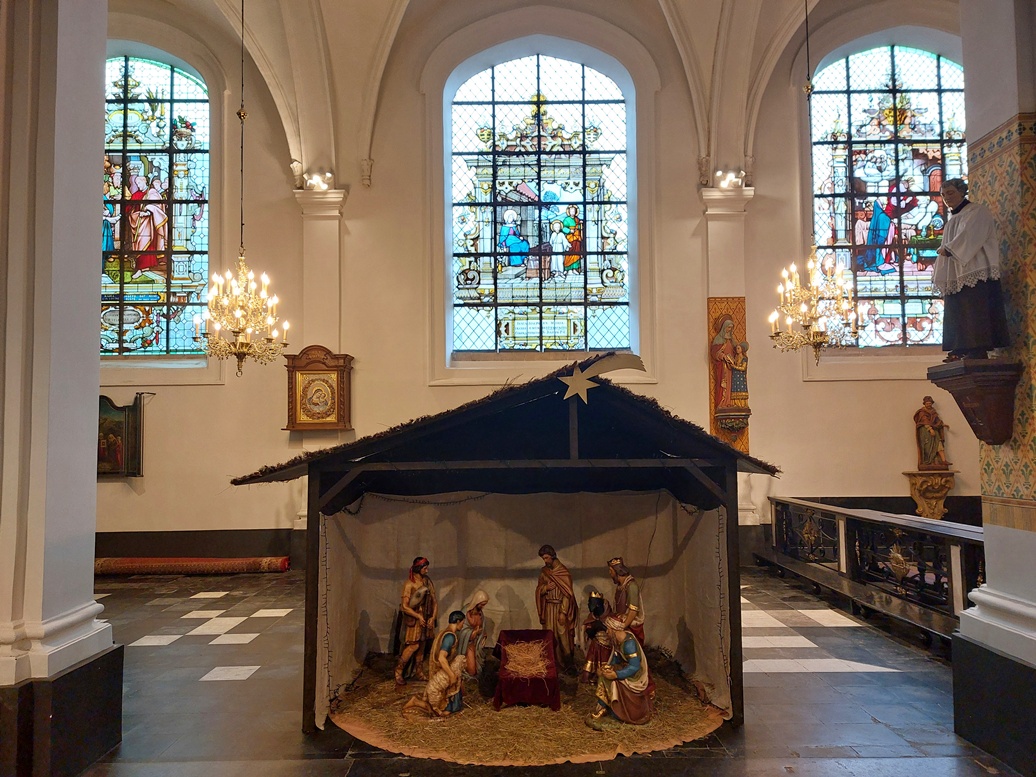 Deze techniek heet ‘cathedral window’, want als je meerdere van deze vormen aan elkaar zou naaien krijg je een soort kaleidoskoop- of kathedraal-effect. Maar als ik in bewondering naar boven staar, als ik zo’n grote kerk bezoek, dan zie ik meestal geen kerstmannen sjouwen met bomen….