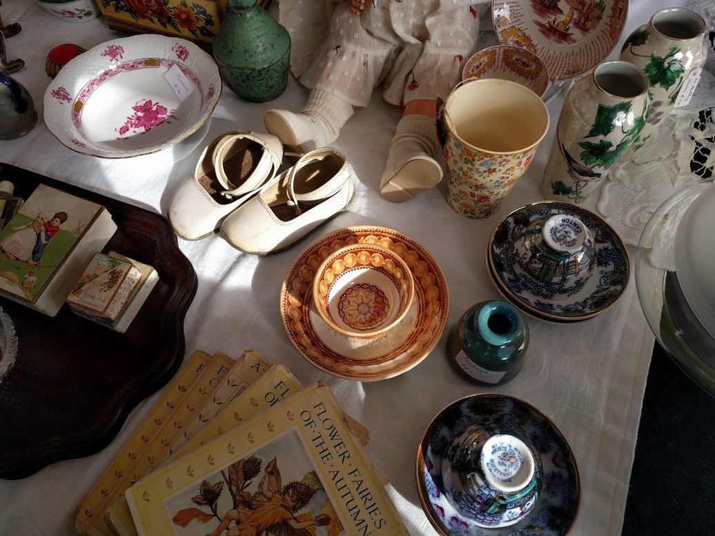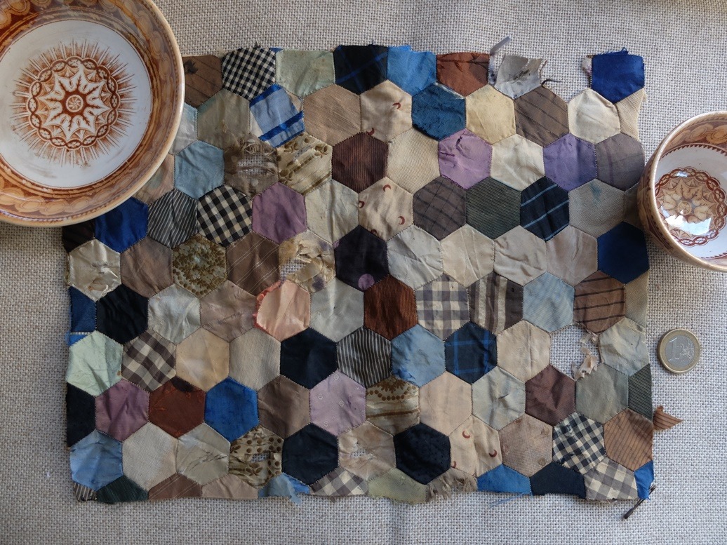 En even later kocht ik een klein lapje van patchwork. Nog nooit eerder zoiets gezien op een markt. De hexagonnetjes zijn klein en kwetsbaar. Hoe oud zou het zijn? Voor Maastrichts aardewerk bestaan er boekjes waarin je precies kunt opzoeken wanneer een bepaald produkt is gemaakt. Voor handwerk zijn er andere methoden. Deskundigen kijken dan naar de gebruikte stofjes. Hoe lang geleden werden er geruite stofjes gebruikt? Als iemand het weet, mag ze het zeggen! Ik zou best willen weten hoe oud dit lapje is. Vermoedelijk is het van een dekentje van een poppewiegje. De rest is vergaan, en dit patchwork met piepkleine steekjes is nog over. Bijzonder, om zo een tastbaar kijkje in het verleden te hebben.
