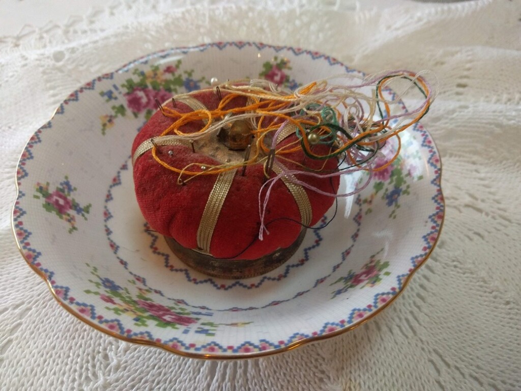 Een oud speldenkussentje, in de vorm van een kroontje.