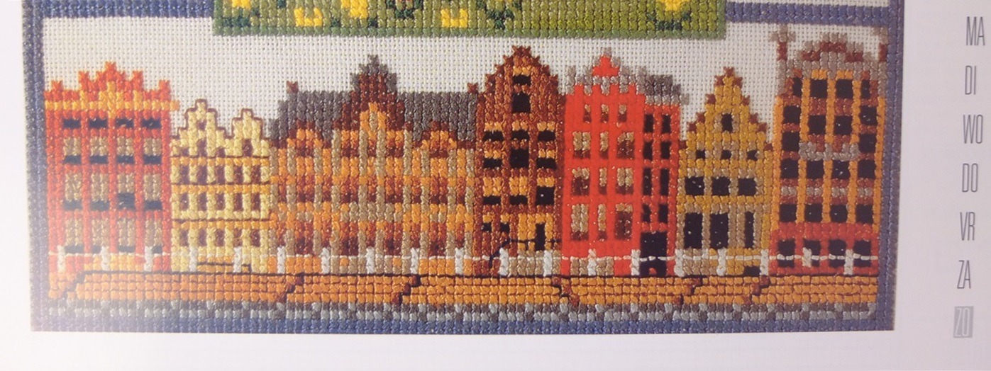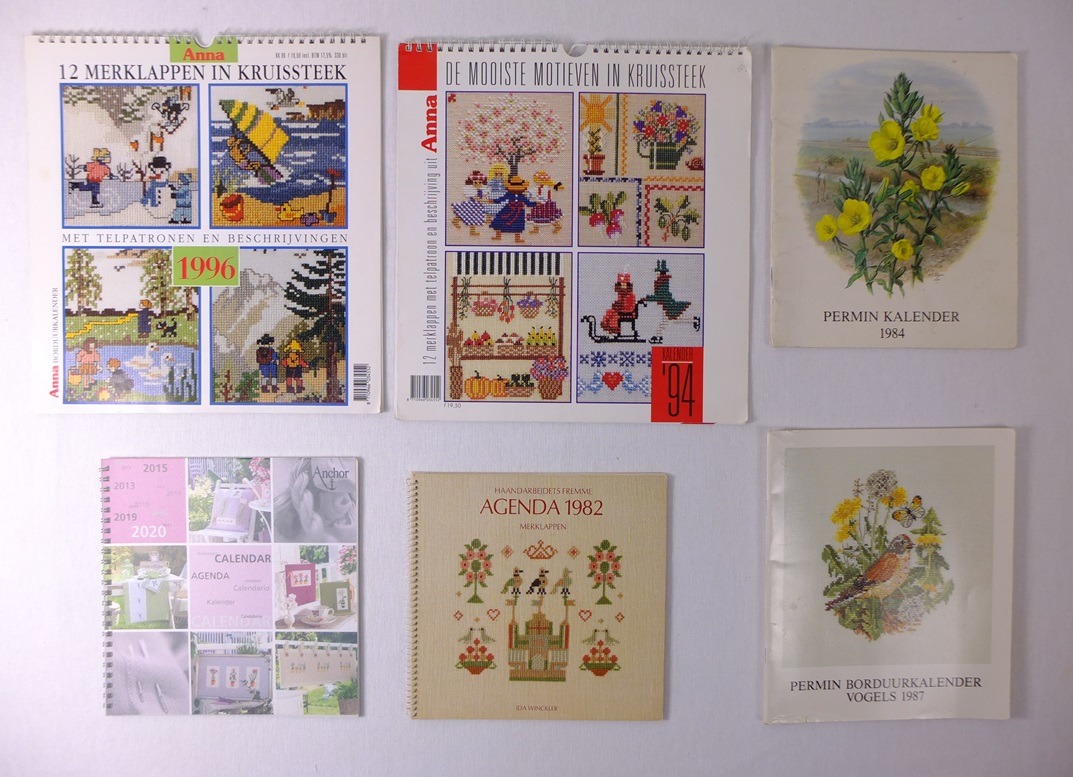 Deze kalenders staan boordevol kruissteekpatronen. Ze zijn uitgegeven in 1982, 1984, 1987, 1994 en 1996 maar ze zijn eigenlijk net als de Anchor-agenda linksonder tijdloos. De helft van deze kalenders zijn geliefde verzamelaarsobjecten, te weten de kalenders van Haandarbejdets Fremme en Permin. Van de twee kalenders die door de Anna zijn uitgegeven weet ik niet zeker of ze ook zo gewild zijn. In ieder geval zijn ze erg mooi en ik voegde heel wat foto’s toe aan de galerij om te laten zien hoe leuk ze zijn. Ook schreef ik een mailtje naar de redaktie om te vragen of ik het patroon van het huizenrijtje mocht gebruiken. Maar daar heb ik geen antwoord op gekregen. Jammer, want ik dacht dat deze leuke