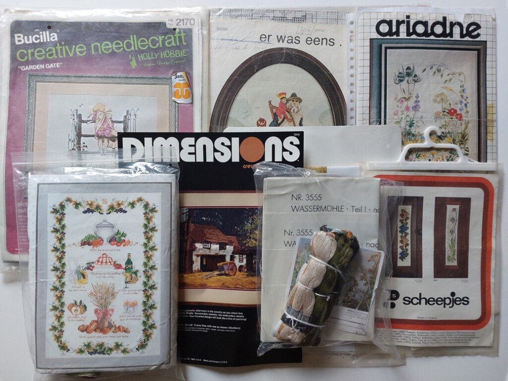 Nu ook nog wat andere oude borduurpakketten voor m’n shop. Eigenlijk wil ik daar niet teveel van die oude pakketten meer in plaatsen, maar ik merk dat ze toch wel gewaardeerd worden. Zoals het grote pakket met voedsel (veel werk om te maken, en er zit ook veel garen bij) en het Permin-patroon van de wilde bloemen (dat heeft iemand anders al gebruikt, en ze liet de restjes garen als houvast achter in de originele verpakking).