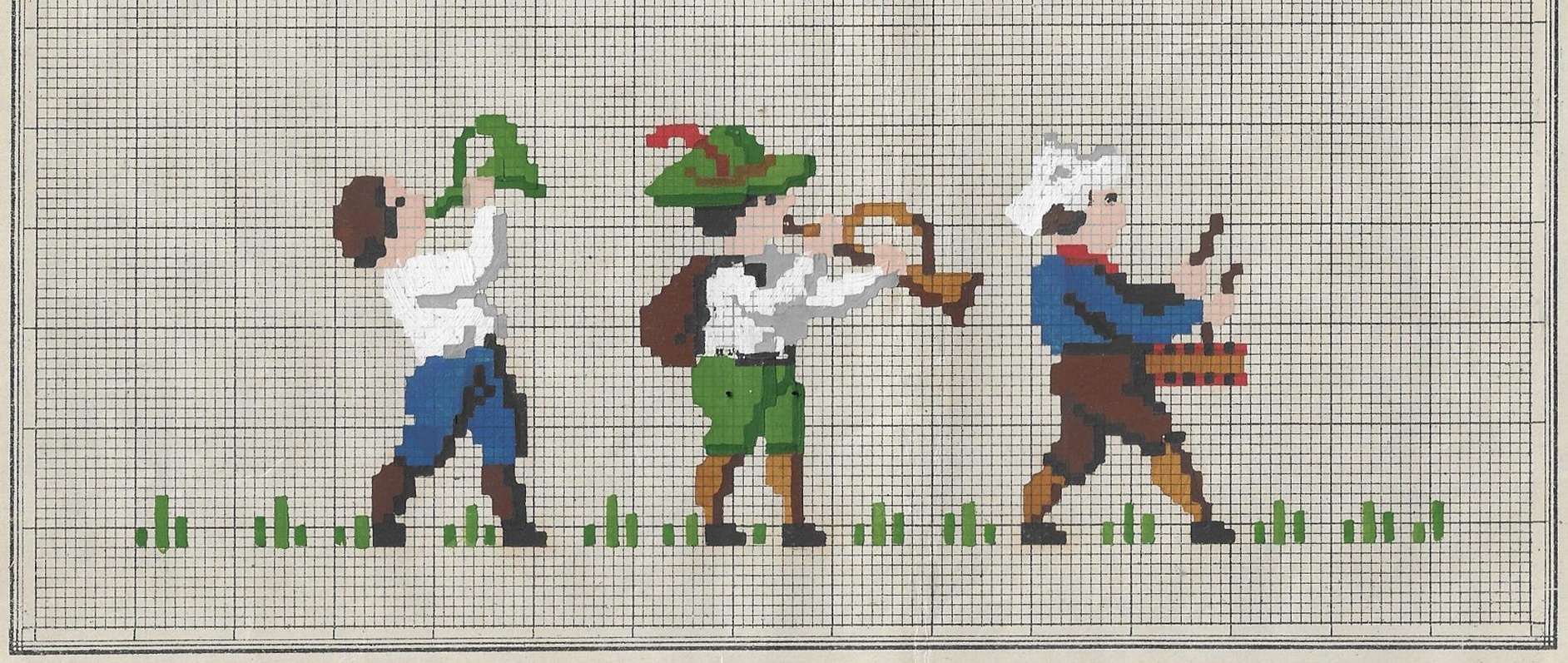 Deze plaatjes komen van drie patronen die met de hand zijn ingekleurd. Dat kun je op deze weergave goed zien. Er waren nog geen patronenboeken met volop keus, en ook geen grote stroom van tijdschriften. Als je wilde borduren, dan waren deze losse patronen beschikbaar.