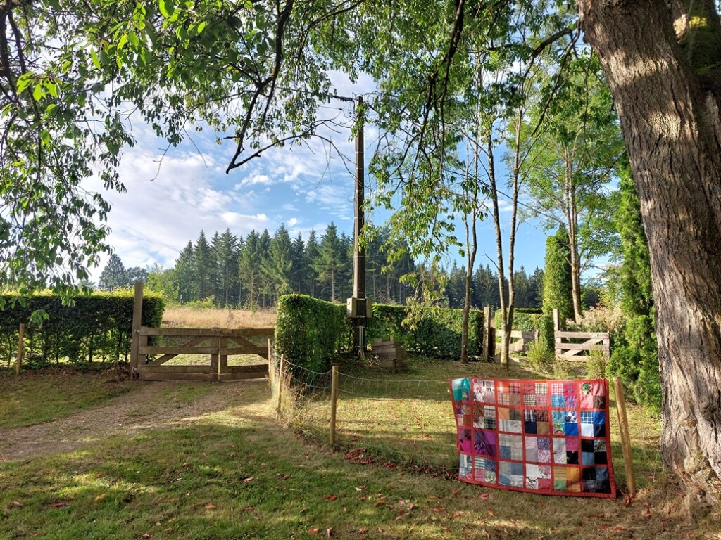 Toch kan het uitzicht (vind ik) nog nèt een beetje mooier, door wat quilts over het hek te hangen. Ik geef toe: het hòeft niet. Zonder is ook mooi.