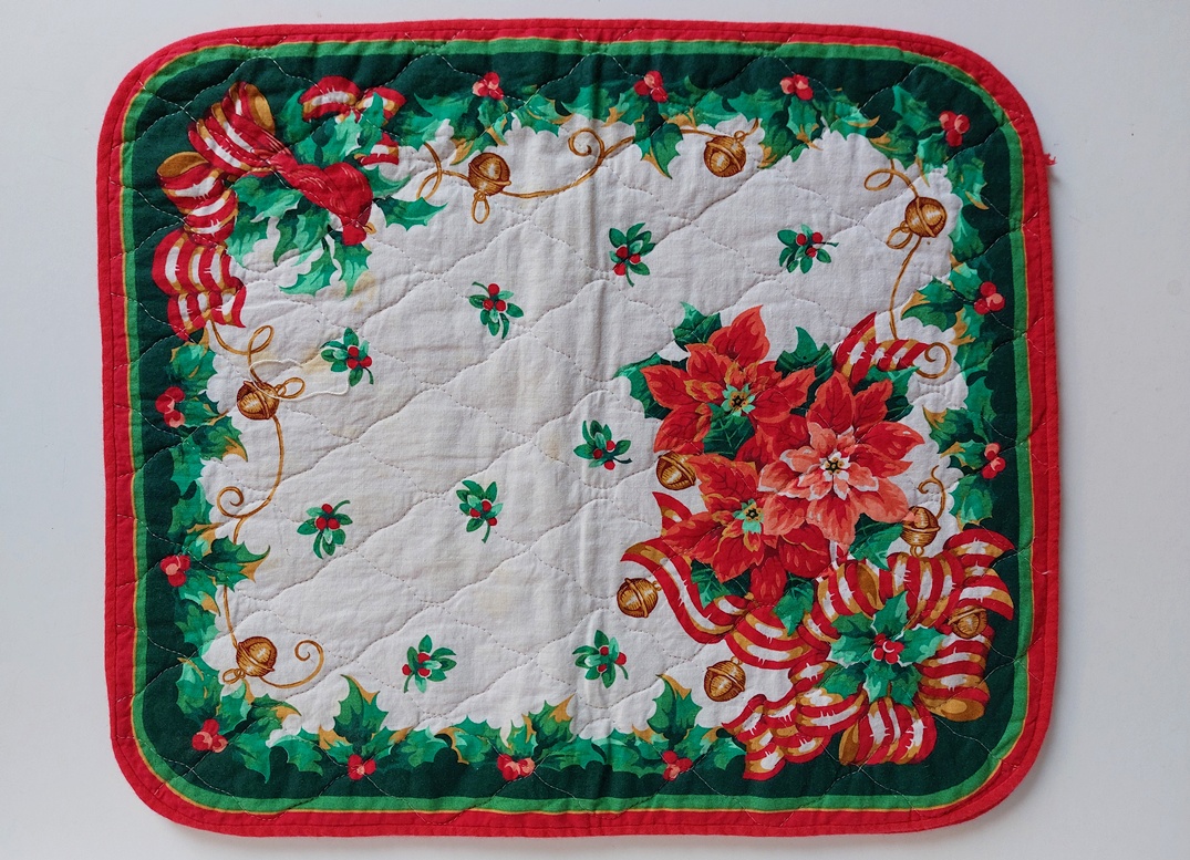 Elke keer als ik iets kersterigs tegenkwam, deed ik het in een december-doos en nu haal ik daar elke dag wat uit om het op een blogje te laten zien. Vandaag deze oude placemat, in een nineties-stijl. Toen waren we er dol op, maar nu liggen dit soort dingen op de kerstkmarkten in de kringloopwinkel. Deze stijl van voorbedrukte stof voor een doorgestikte gewatteerde placemat is een beetje uitgewerkt.