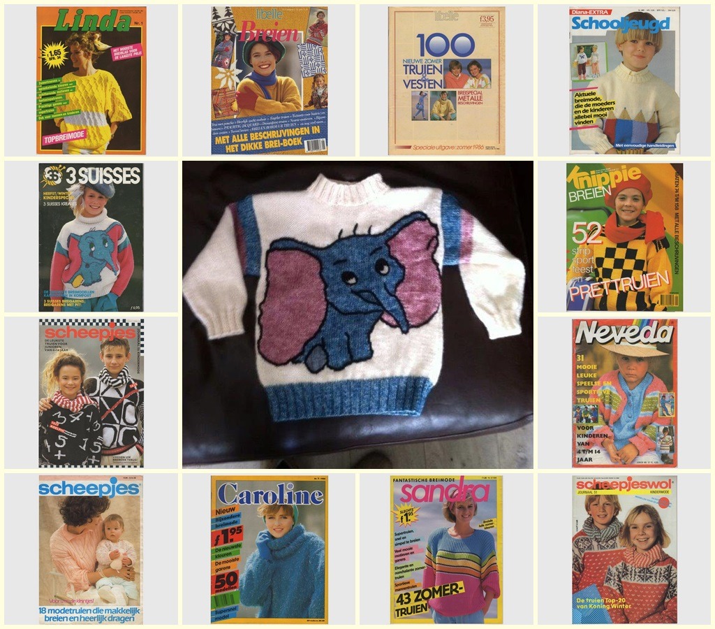 Een bloglezeres was blij dat ze het oude tijdschrift van 3 Suisses in mijn shop ontdekte, met de gebreide olifant voorop, want daar was ze al een hele tijd naar op zoek. Vroeger had ze die trui voor haar dochter gebreid, en nu wilde ze hem voor haar kleinkind breien. Ik kreeg een hartelijk mailtje van haar, en een tijdje later nog eens een mailtje: nu met bijgesloten foto van de trui die ze had gebreid met behulp van het patroon. Ze was er zo blij mee dat ze het patroon had gevonden, en dat vond ik natuurlijk leuk om te lezen.  “Mag ik je foto op m’n blog laten zien?” vroeg ik aan haar en dat was goed. Want het is voor mij ook een goede illustratie van waarom ik deze tijdschriften in m’n shop heb gezet. Het zijn oude tijdschriften uit de zeventiger en tachtiger jaren en veel vrouwen die nu weer de breipennen ter hand nemen hebben er goede herinneringen aan. Niet altijd liggen die oude tijdschriften nog op zolder en dan kan het een mooie ontdekking zijn om ze nog eens via internet terug te vinden. Ze worden trouwens weer volop gebruikt, merkte ik. In kringloopwinkels en op rommelmarkten vliegen ze weg (dat zei een winkel-medewerkster aan wie ik vroeg of ze nog oude handwerktijdschriften had). “O mevrouw, die halen de avond niet eens. Als we die ’s morgens in de winkel leggen, zijn ze ’s avonds geheid weg.” Bij mij loopt dat nog niet zo hard, maar ik vond het wel heel leuk dat dit breipatroon van de olifanten-trui zo goed terecht is gekomen bij iemand die daarnaar zocht. En de trui zelf is natuurlijk heel mooi geworden! Leuk voor dat kleinkind om zo’n lieve breiende oma te hebben!