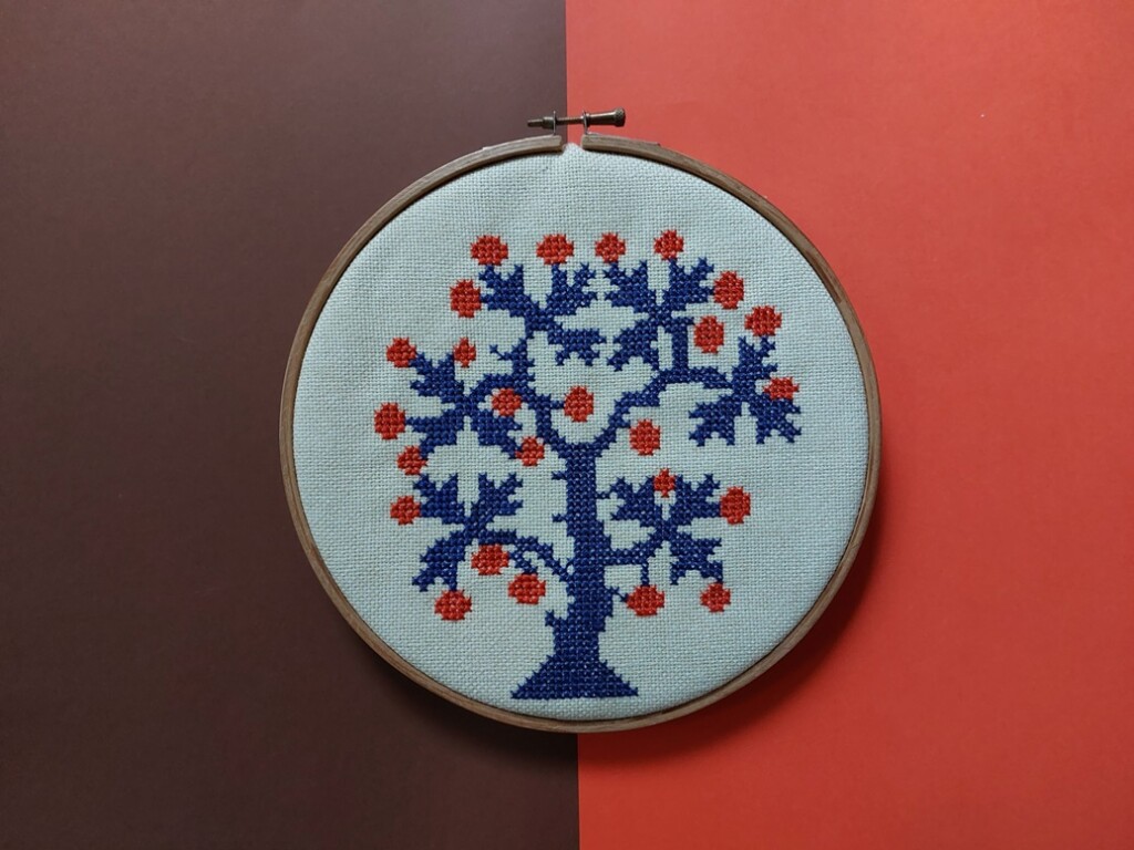 De levensboom was mijn meest geliefde motief om te borduren. Ik zou nog veel meer foto’s kunnen opzoeken van de levensbomen die ik borduurde, maar op dit moment geniet ik van de verbondenheid met m’n familie. Ik geniet van het fysieke: de gezelligheid in de kamer, de knallen buiten, de lekkere hapjes, en een fles met bubbeltjes. En we beleven de geestelijke kant van het leven in blijdschap en verbondenheid.