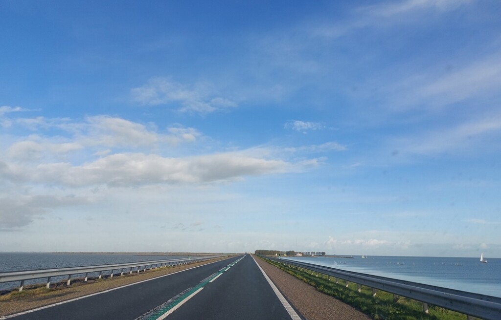 We denken terug aan die allereerste keer, dat we die lange dijk overgingen. We waren alleen nog maar via Amsterdam naar onze nieuwe woonplaats geweest en kenden die dijk nog helemaal niet. De eerste keer dat we daarop reden was in de verhuisauto, die ons en onze spulletjes naar Bovenkarspel reed. Daar gingen we wonen! Het was die dag heel slecht weer, en we konden gewoon niet geloven dat er na die eindeloze kilometers grijzigheid nòg geen einde aan kwam. Waar waren we aan begonnen? Waar gingen we nòu toch helemaal naar toe?