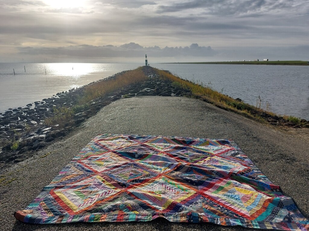 Voor ons was de overkant van het IJsselmeer het ‘Nieuwe Land’ waar we naartoe verhuisden. Ik was in verwachting van onze eerste en alles was nieuw. Mijn man begon na zijn studie aan zijn eerste baan. In de onbekende streek, het oude land West-Friesland, beleefden we onze gezinsjaren en bouwden we ons bestaan op. Mijn hobby om met lapjes en draadjes bezig te zijn ontwikkelde zich daar ook. Ik naaide o.a. veel kinderkleertjes en alle restjes bewaarde ik. Later, toen we we weer terug-verhuisd waren naar Gelderland, maakte ik van al die restjes grote lappendekens. Eén van die quilts had ik gister meegenomen. Ik had het precies in mijn hoofd: precies halverwege die dijk wilde ik die quilt op de foto. Zo blij dat het gelukt is!