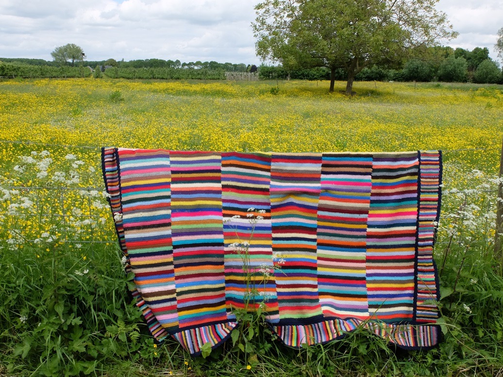 Ach, en toen moest ik tòch weer even stoppen. Op een paar honderd meter vanaf de Waal zag ik dit weiland. Toen haalde ik tòch weer even de gehaakte deken uit de auto….. Het ging gewoon vanzelf…. Mijn geniet-momentje!
