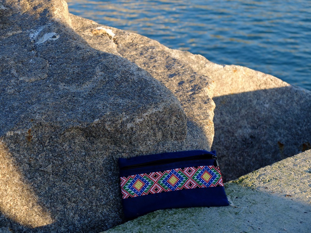 Het was een merkwaardige gewaarwording om te merken dat die paar uur naar het noorden rijden zoveel effect heeft op de langere dag. “Merkwaardig” is ook de naam van een vereniging van kruissteek-liefhebbers. Een tijdje geleden vierde die vereniging een jubileum en kreeg iedereen een bedrukte tas. Ik vind het een fijne tas om mee te nemen. Elke tas heeft z’n eigen praktische nut voor wat je erin wilt doen. Na al die uren in de auto wilden we hier op deze kade wel een tijdje rondhangen tot het slaaptijd was, en ik begon maar vast om hetgeen ik in de gauwigheid had meegenomen naar de kade te fotograferen. Niet dat dit nu de meest boeiende foto is, maar ik moet toch ergens beginnen? En ik probeer in elk vakantie-blogje wat handwerk te stoppen. Zoals dit etuitje, wat ik steeds overal mee naar toe nam. Er zit een klein handwerkje in, om op elk gewenst moment even wat te borduren. Ik maakte het lang geleden na een tip van een handwerkjuf. Zij vertelde dat ze haar leerlingen vaak zo’n etuitje liet maken. De opdracht was om een stukje te borduren wat precies lang genoeg was voor een ritssluiting van 18 cm. En daarna maakte de juf er dan een etuitje van, met een simpel restje stof. Als de afmetingen goed zijn, is het resultaat ook goed.