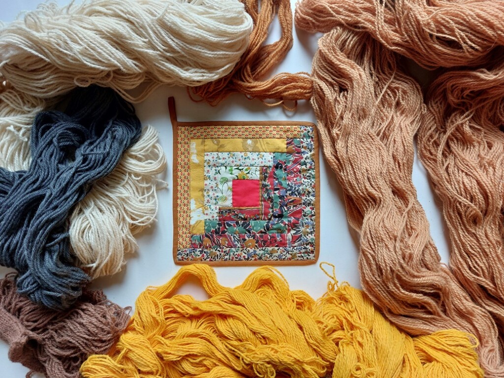Het leuke van log cabin is dat stofjes bijna altijd wel bij ekaar passsen, zolang je je aan de basis houdt: donkere kleuren aan de ene kant en lichte kleuren aan de andere kant. En een ‘haardvuur’ in het midden.